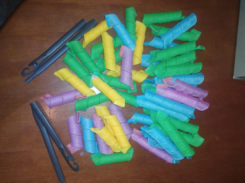 Бигуди Magic LEverag – вьющиеся локоны быстро и легко. Огромное преимущество этих беговей - отсутствие необходимости в нагревании волос. Для создания красивых вьющихся локонов вам потребуются волшебные бигуди Hair Wavz и немного часов. Бигуди представляют собой пластиковые «пружинки», которые распрямляются надеясь на специальный стержень с крючком на конце. С помощью этого крючка вам необходимо зацепить и протянуть в беге небольшую прядь волос.Буквально через 3 часа беги можно снимать и полученный результат вас приятно удивит! Как пользоваться силиконовыми бегами Magic LEverag: На вымытые и подсушенные волосы наносим немножко пенки и начинаем накручивание. Распределение волос на дорожки начиная с затылочной зоны. Ширина может быть разной в зависимости от желаемого конечного результата. Выделяем первую прядь. Вставляем крючок в бегах и с помощью крючка втягиваем пряди внутрь бега, таким образом накручиваем нижнюю область. Волосы скроневой и тимняной зон накручиваются в зависимости от будущей прически, расположение проделов. Последовательность накручивания выполняется по тем же правилам. Накрутив все волосы, подсушиваем феном 15-30 мин, или естественными образом. Сняв бигуди, формируем в прическу. Плюсы силиконовых бегадей: Возможность не использовать все средства укладок – кудряшки без них держатся до двух дней! Можно использовать как при сушении феном, так и при щадящей завивке (выдохание волос натуральным образом). Не будут мешать спать, так как бигуди очень мягкая. Характеристики: Количество 52 шт спирали (11 см) - 27шт спирали (8 см) - 25шт Ширина 2 см Материал: пластик Цвет: разные. состоянные идеально!