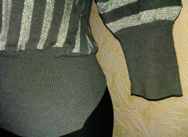 Нарядный джемпер в полоску серого цвета и "металлик". Рукав 3/4. Тонкий трикотаж, синтетика. Покупался новый, одетый 1-2 раза. Состояние хорошее, без дырок, без пятен, нет катышков, резинки не разтянуты. Размер 46 наш, замеры по запросу.