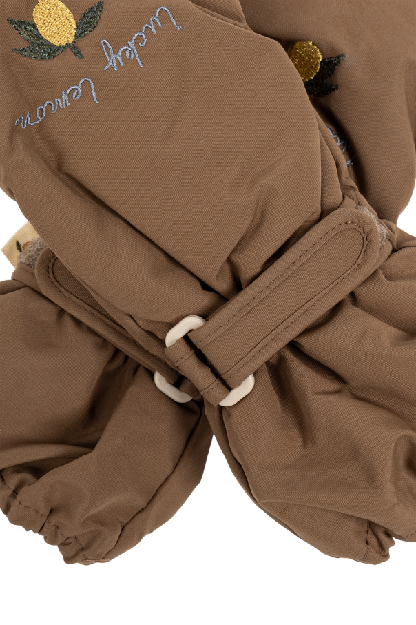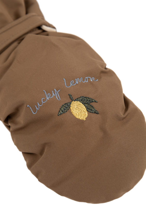 Introducing the Konges Sløjd Animal Motif Mittens, an exquisite addition to your child's winter wardrobe. Crafted from premium brown polyester, these mittens epitomize both elegance and practicality. Featuring a classic, single-finger shape, these mittens are adorned with an intricate lemon embroidery and the charming phrase "lucky lemon" in a delicate light blue hue. This unique design element elevates the mittens beyond mere functionality, making them a fashionable statement piece. Constructed from a robust material that is not only water-resistant but also moisture-repellent, these mittens are perfect for snowy adventures. The elastic cuffs ensure a snug fit, while adjustable straps with Velcro fastenings provide extra security and comfort, keeping the cold at bay. The Danish brand Konges Sløjd, established in 2014 by Emilie Konge, is renowned for its commitment to sustainable production. Known for using organic cotton certified by GOTS and other eco-friendly materials, Konges Sløjd's designs are both functional and meticulously crafted, making parenthood simpler and more stylish. Why Choose This Product? Elegant and unique design with "lucky lemon" embroidery. Water-resistant and moisture-repellent material. Elastic cuffs and adjustable Velcro straps for a secure fit. Produced by a brand committed to sustainability.