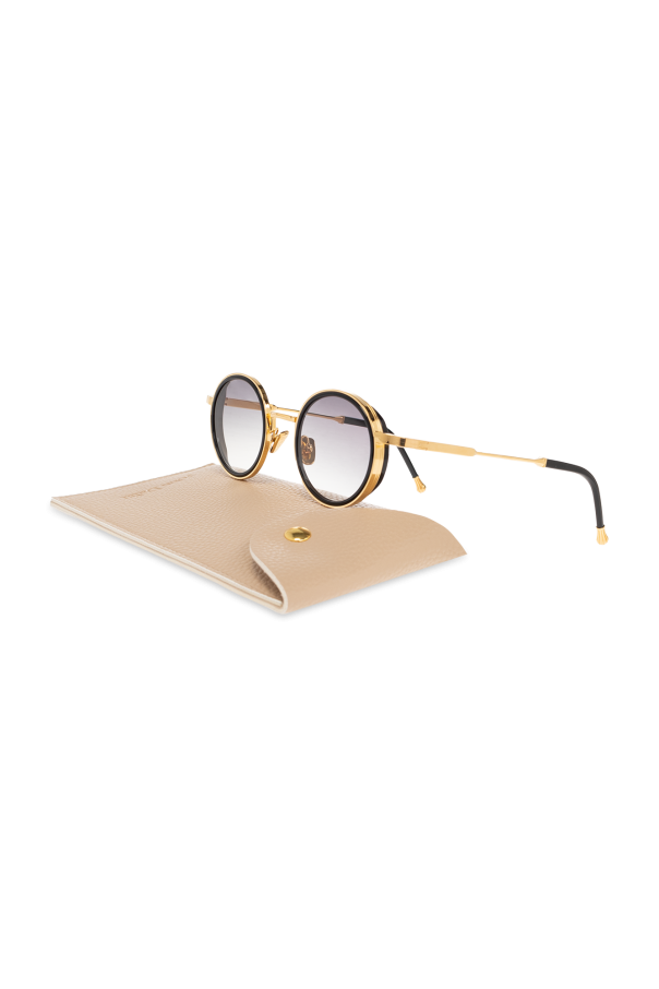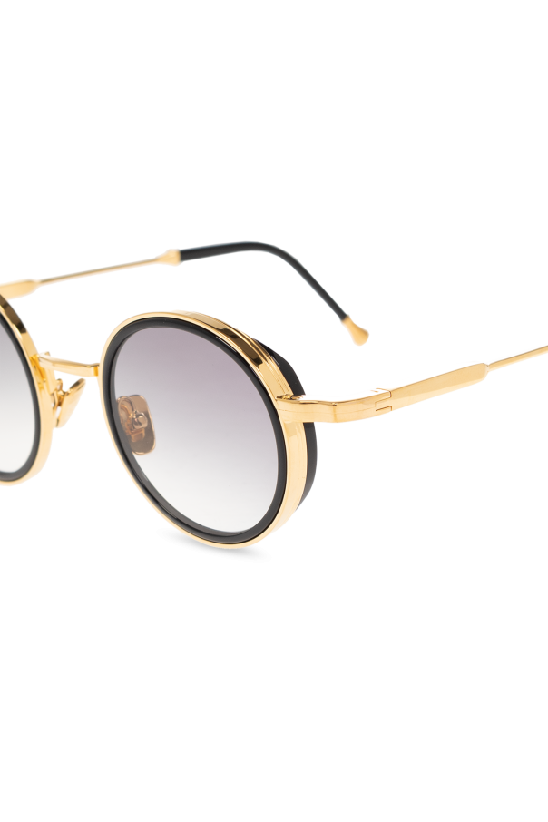 Black and gold-tone ‘Daniel’ sunglasses from John Dalia. A round frame shape with acetate rims cut that stands out from the 4mm streak-engraved metal. Single bridge complete with adjustable branded nose pads. 22-carat yellow gold-plated alloy frame (c. 5µ layer and jewelry stamp inside the temple). Grey gradient CR39 lenses with AR treatment. Case included. Handmade in France.