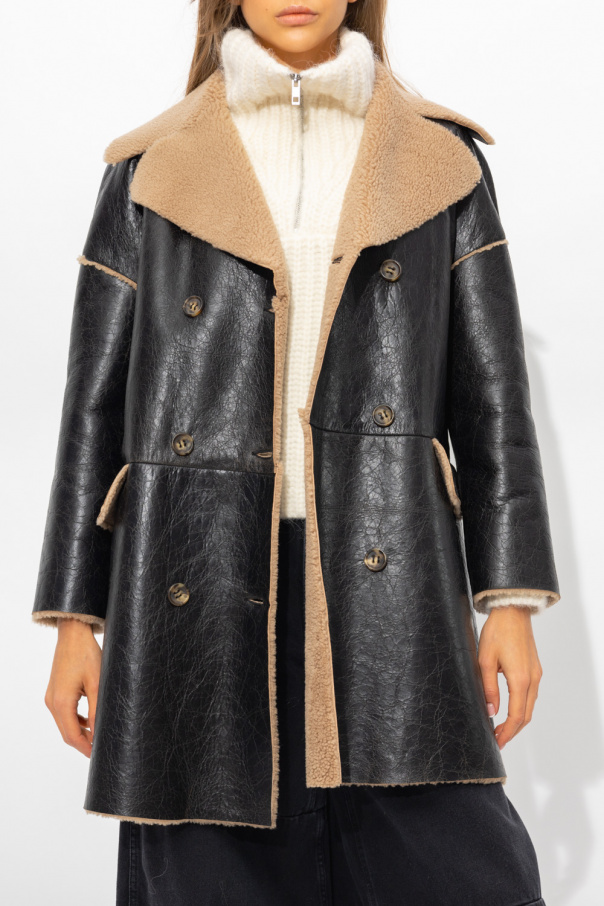 Black shearling coat from Red Valentino. Crafted from lamb leather and lamb fur with a vintage effect, this style features a double-breasted silhouette with button fastenings, notch lapels, two flapped pockets, long sleeves and a beige lining.