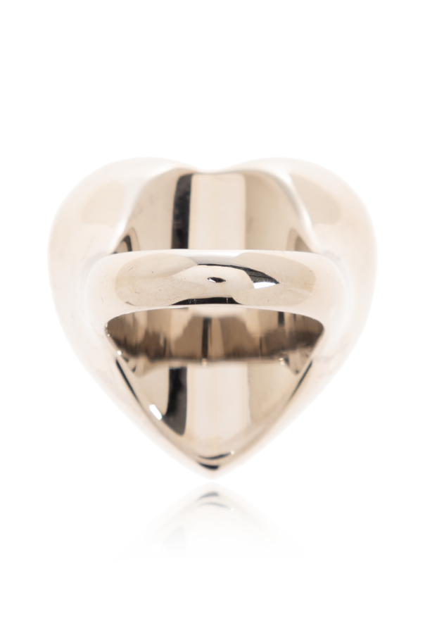 Silver-tone heart-shaped ring from VETEMENTS. Made of brass, this item showcases a transparent crystal and an engraved logo.