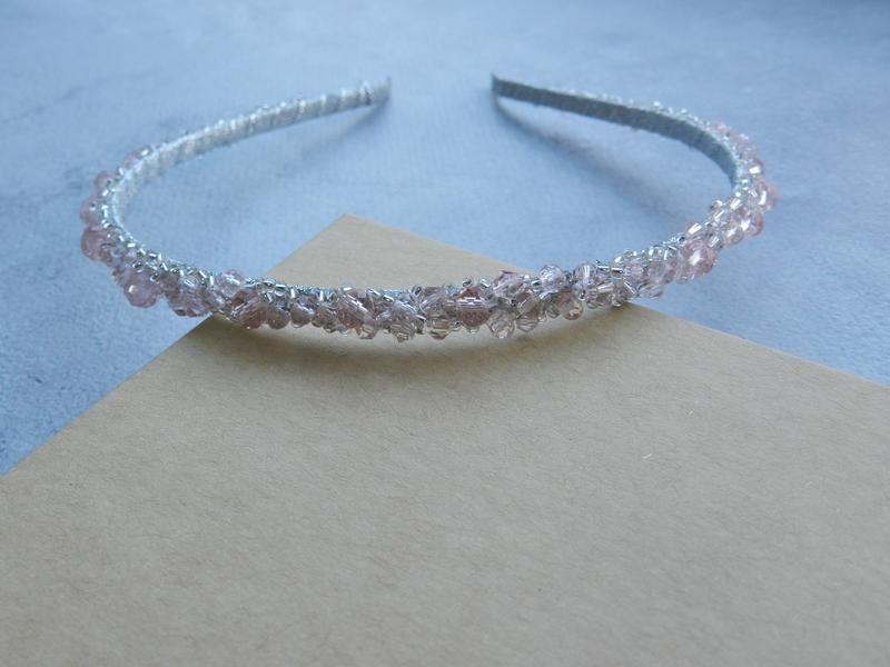 Тонкий ободок , расшит хрусталем , керамическим жемчугом и бисером .