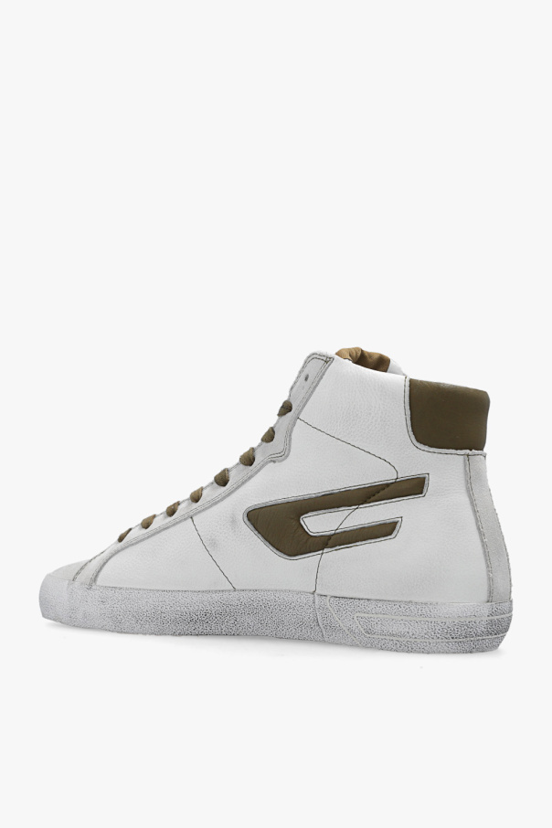 White and green ‘S-LEROJI MID’ high-top sneakers from Diesel. Crafted from leather with a vintage effect and trimmed with suede, this lace-up model sits on a white and orange rubber sole and features a branded tongue patch and tactile monogram detailing on the side.