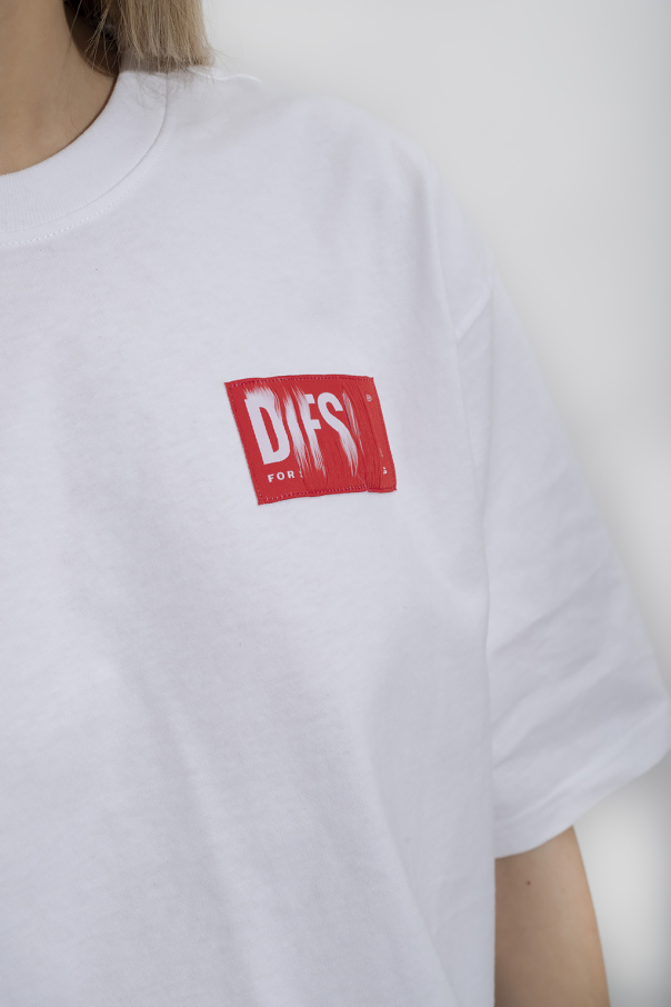 White ‘T-NLABEL’ T-shirt with logo from Diesel. Made of cotton, this short sleeve design features a red and white logo patch and ribbed crew neck.