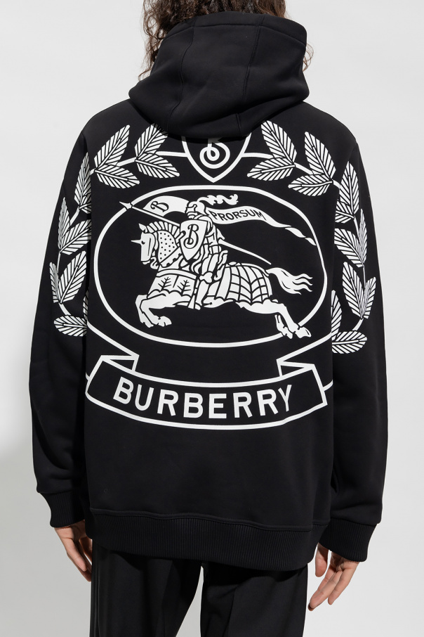 Black ‘Avondale’ sweatshirt with a drawcord-adjustable hood from Burberry. Crafted from organic cotton with a relaxed fit, this style features a rubberised logo application on the front, two slip pockets, the ‘Equestrian Knight’ print in white at the back, and elasticized trims on the bottom hem and long sleeves.