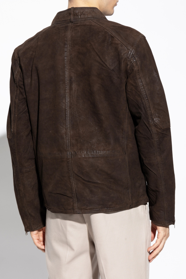 Introducing the 'Cora', an exquisite brown leather jacket for men by the renowned East London brand, AllSaints. This jacket is crafted from premium quality leather, epitomizing the essence of luxury and sophistication. The 'Cora' jacket features a central metal zipper that elegantly extends from the bottom hem to the collar, ensuring a sleek and polished closure. The standing collar, secured with an additional snap button, enhances both the elegance and functionality of the piece. With two front zippered pockets, the jacket offers practical storage solutions for your essentials, while maintaining a streamlined appearance. The classic cut of this jacket, complete with simple cuffs and rear stitching details, ensures a flattering fit that seamlessly adapts to any silhouette. Embodying a minimalist design, this jacket's luxurious material and meticulous craftsmanship make it a versatile addition to your wardrobe, perfect for both casual and formal occasions. Why Choose This Product? High-quality brown leather for an exclusive look Central metal zipper for a stylish closure Standing collar with snap button for added elegance Two practical front zippered pockets Classic cut with understated cuffs and distinctive stitching Versatile design suitable for various occasions Iconic AllSaints branding for unparalleled style