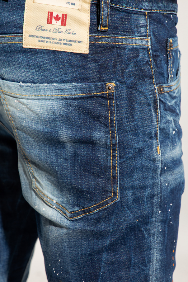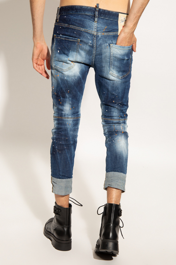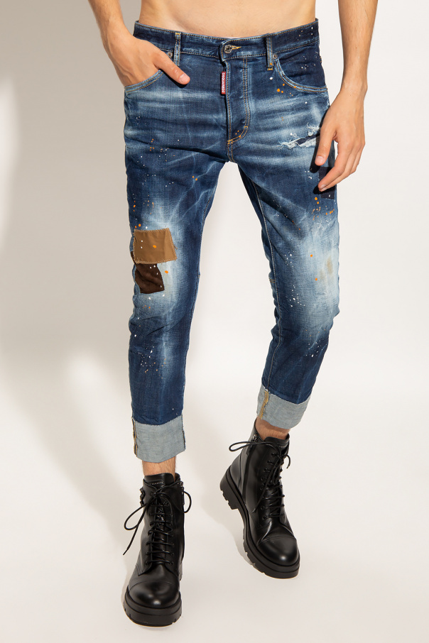 Blue ‘Sailor’ distressed jeans from Dsquared2. Fastened with buttons, this straight leg design features stitching details, faded effect, paint splatter motif, logo patches, five slip pockets and tapered, cropped legs.