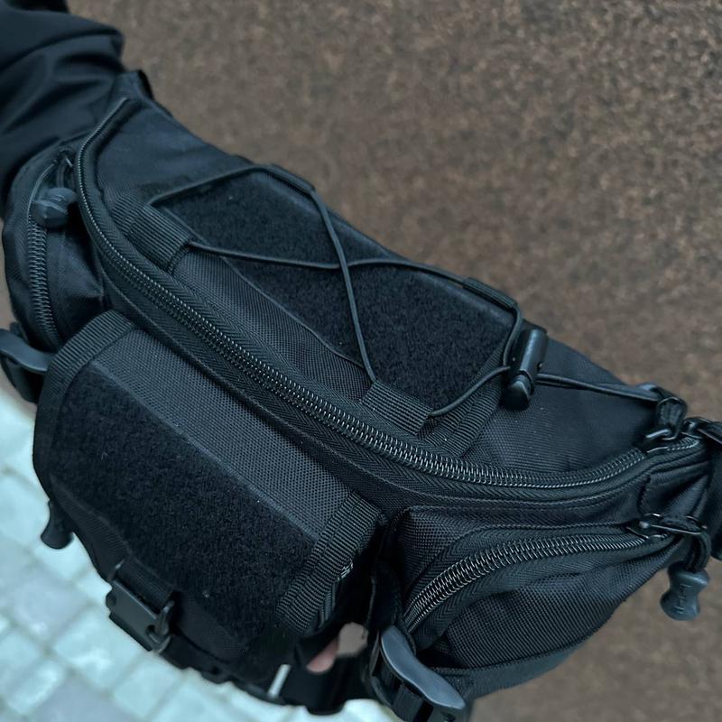 Черная поясная, нагрудная тактическая сумка. Сумка, бананка очень вместительная и удобная. Можно носить как на поясе так и на груди. Правильное расположение отделов и карманов позволяет вместить много необходимых аксессуаров, документов и т.д.