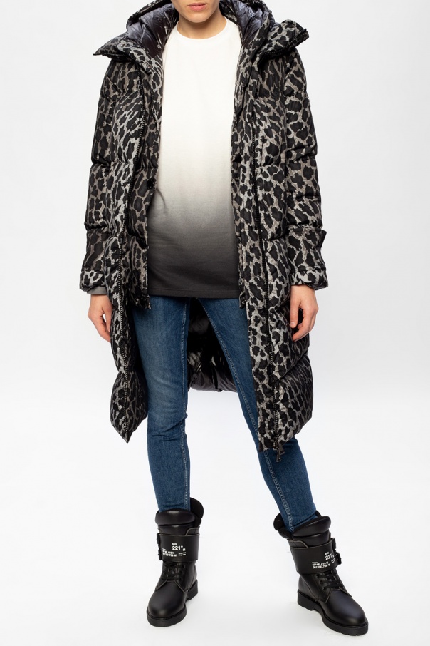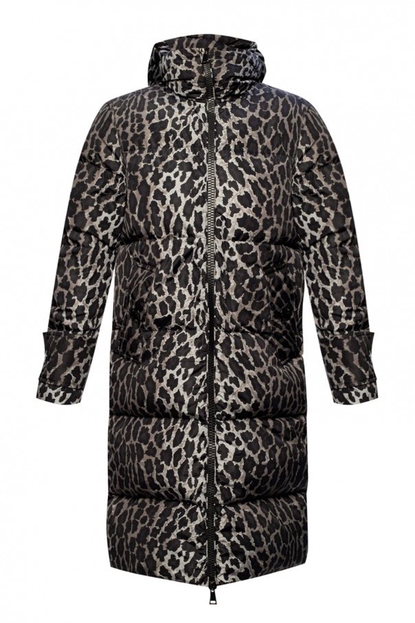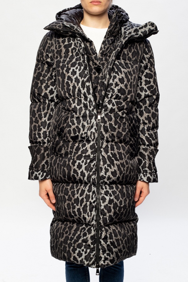 Black and grey ‘Keller’ quilted down jacket from Moncler. Decorated with leopard print and silver-tone logo plaque, this puffer jacket is complete with two-way zip and snap fastenings, two snap-fastened pockets on the front and a detachable hood.