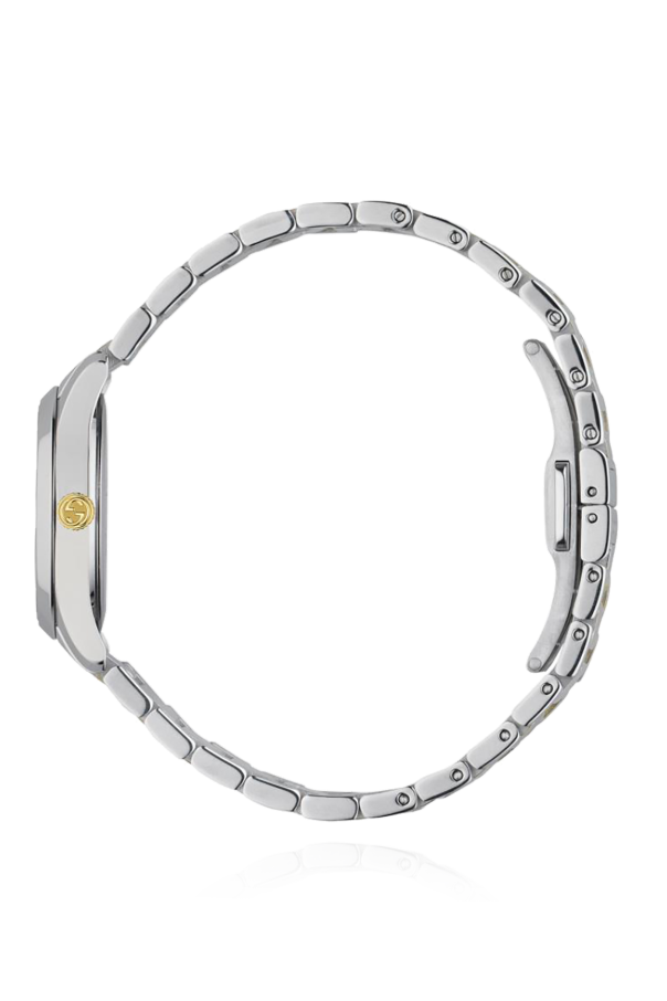 Introducing the epitome of sophistication and versatility: the Gucci Logo Watch. Crafted with meticulous attention to detail, this timepiece is a harmonious blend of classic elegance and distinctive flair. Its body and bracelet, forged from 100% Stainless Steel, boast a stunning interplay of silver and gold tones, setting a luxurious stage for the unique dial that lies within. The dial itself is a canvas of light silver, adorned with stars, hearts, and the subtle yet unmistakable outlines of a cat's face, a signature motif for the brand. The proud "Swiss Made" inscription not only promises unparalleled precision but also speaks volumes of the watch's esteemed origins. Accentuated by a golden crown on its side, the watch's round case extends into a gracefully elongated form, seamlessly transitioning into the dual-toned bracelet. Whether it's the sleek elegance it adds to a black blazer or the casual sophistication it brings to a simple ensemble of white shirt and jeans, this Gucci timepiece transcends the boundaries of style. Its silver dominant color, enriched with gold accents, ensures it stands out as a statement piece for any occasion. Why Purchase This Product? Swiss Made Quality: Guarantees precision and reliability. Iconic Design: Unique cat face motif and brand logo enhance its distinctive appeal. Luxurious Materials: 100% Stainless Steel with gold and silver tones for a lavish look. Versatility: Perfectly complements both formal attire and casual outfits.