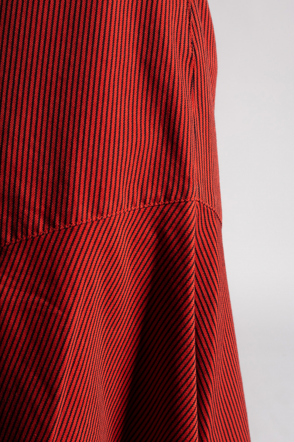Red skirt from Kenzo. Crafted from cotton, this flared design is complete with a button and zip fastening, black stripe pattern, logo patch and two front slip pockets.