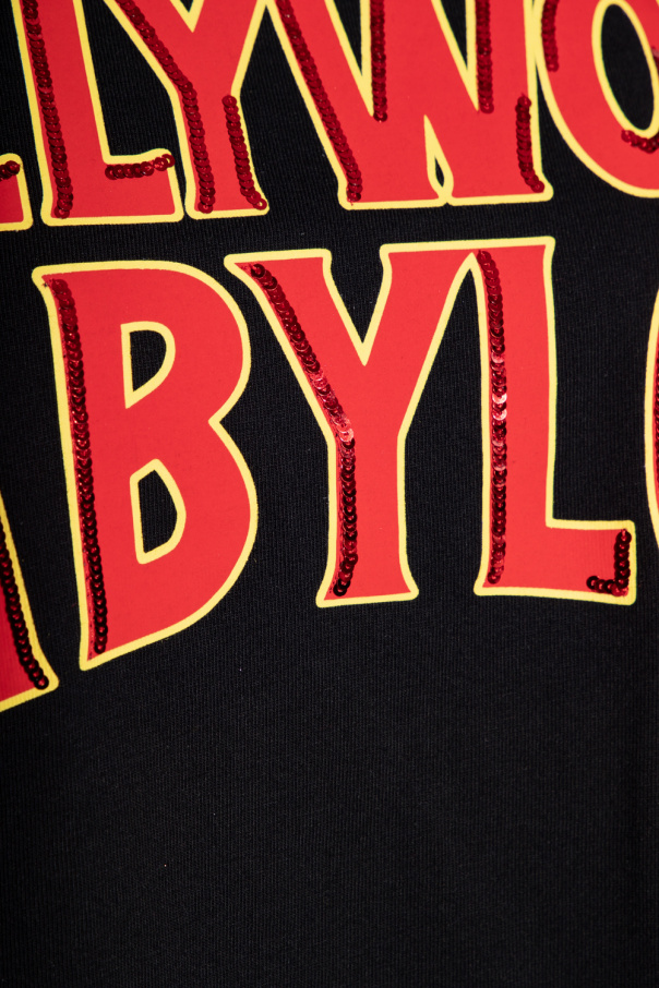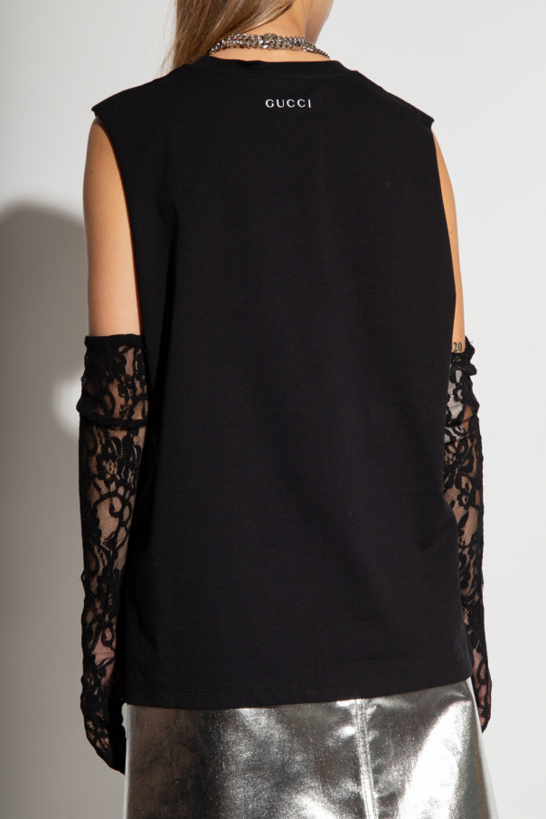 Black sleeveless top from Gucci, the ‘Gucci Love Parade’ collection. Made from cotton, this style features a round neck, a colourful ‘Hollywood Babylon’ print embroidered with glossy sequins on the front, and a printed white logo at the back.