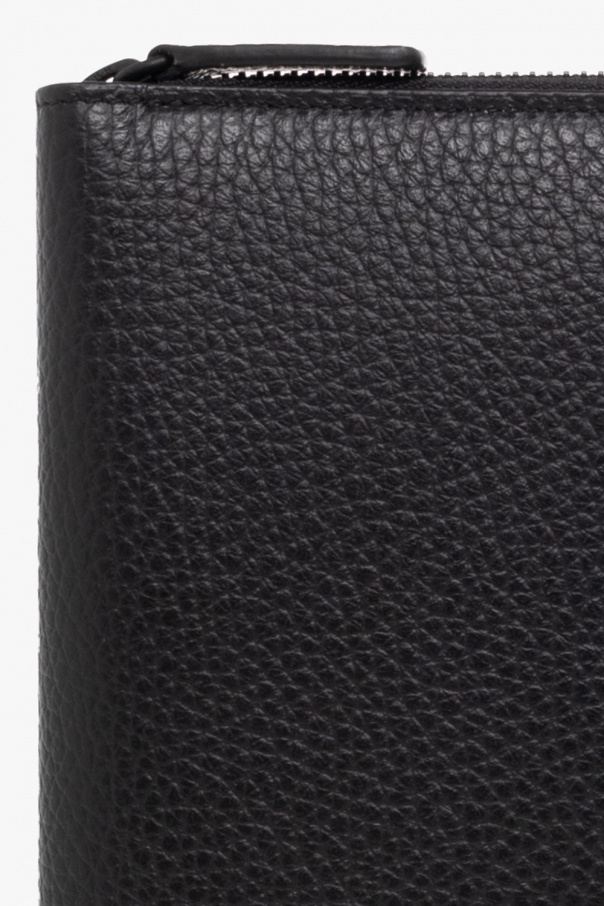 Black wallet from Common Projects. Made of leather, this item features a zip fastening, gold-tone logo print and black metal hardware. It has one zipped coin pocket, two bill compartments, two slip pockets and twelve card slots inside.