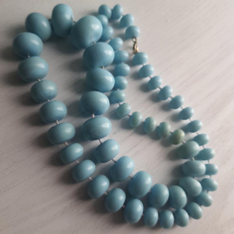Бусины без трещин, но на некоторых есть желтизна, супер классно смотрятся под бирюзовые вещи. Собраны на прочную толстую нить, без застежки, длина в сложенном виде 29 см.