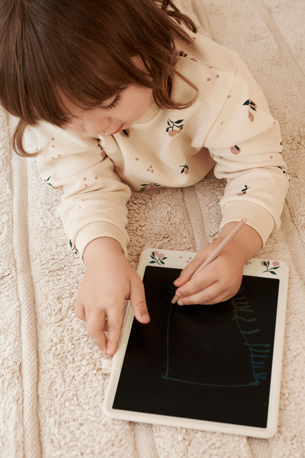 Introducing the Zora Magic Drawing Board, an exquisite creation by the renowned designer, Liewood. This drawing board, adorned in a creamy hue, exudes an air of sophistication, making it a delightful addition to any child's creative toolkit. Crafted from high-quality PVC, the board boasts a lightweight yet durable design, ensuring ease of use and longevity. Its delicate frame is embellished with charming fruit patterns in muted shades of green and pink, adding a touch of whimsy to its elegant appearance. Equipped with a securely attached stylus, the Zora board allows young artists to craft vivid, colorful images on its LCD screen, which can be effortlessly erased for endless creativity. As part of the 'KIDS ACCESSORIES, OTHER' category, this board is the perfect tool for imaginative play. Why Choose This Product? Exquisite design with charming details Lightweight and durable material Easy-to-use stylus for creative expression Perfect for imaginative play for children Crafted by the esteemed brand, Liewood