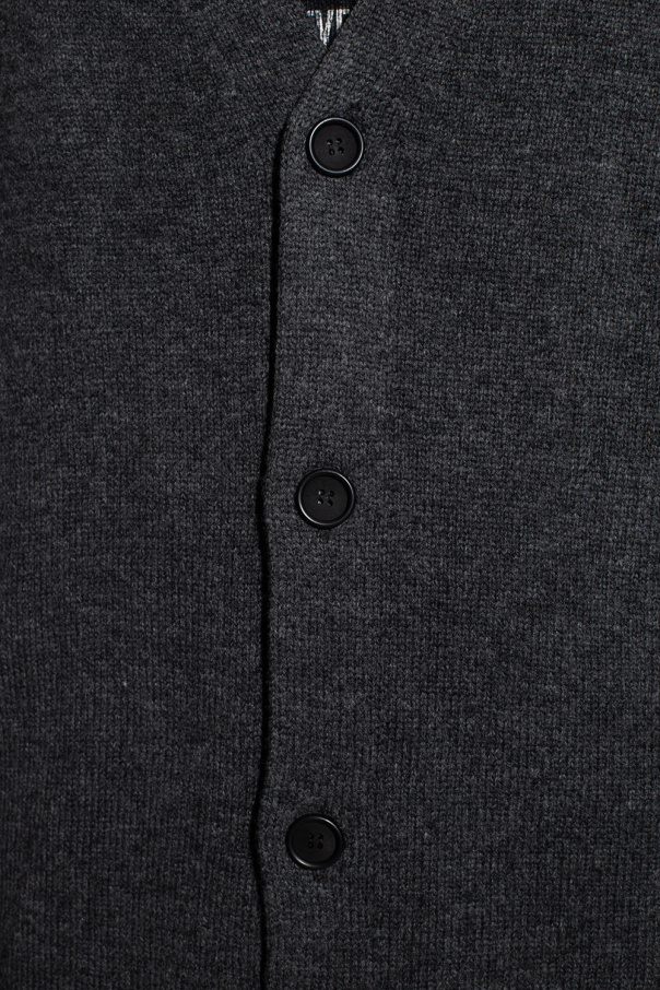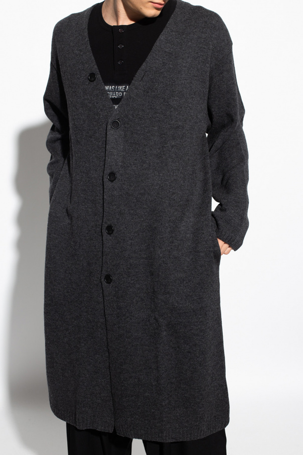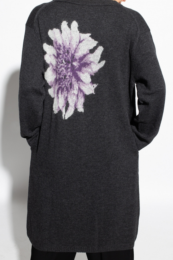 Grey cardigan from Yohji Yamamoto. Made of wool, this style fastens via buttons and features a V-shaped neckline, two slip pockets, elasticated cuffs, bottom slits and grey and purple graphic embroidery on the back.