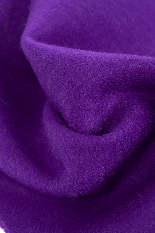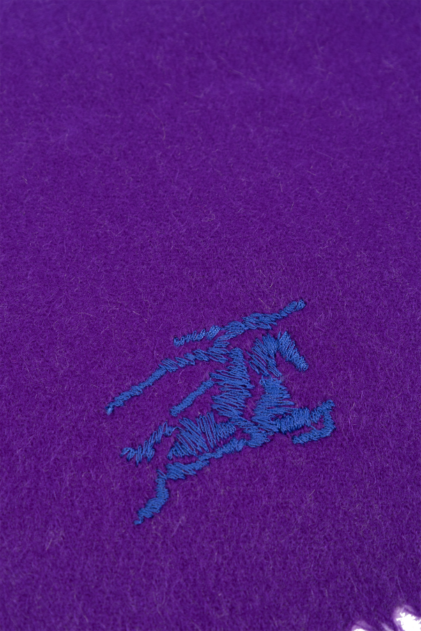 Purple scarf from Burberry. Made of cashmere, this item showcases an embroidered blue logo pattern and fringed edges.