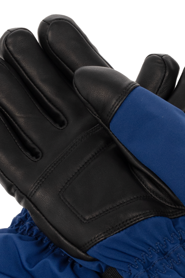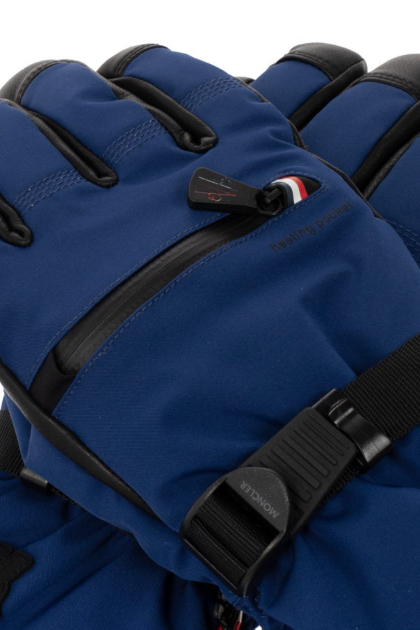 Blue and black ski gloves from Moncler Grenoble x Reusch. Covered with Gore-Tex® membrane and padded with PrimaLoft® Bio™ insulation, this pair features a logo patch, leather trims, one zip pocket and an adjustable strap on the wrist and drawstring cuffs.