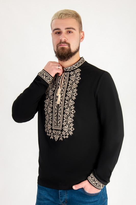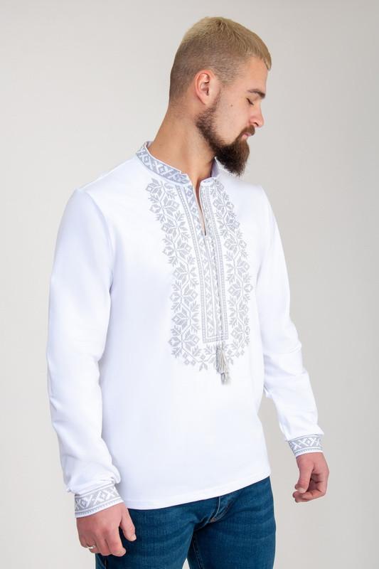 Мужская вышитая рубашка с длинным рукавом выполнена из полотна "Стрейч-кулир пинье". Данная модель прямого кроя имеет воротник-стойку. Воротник, манжеты и перед рубашки украшены вышитым орнаментом.