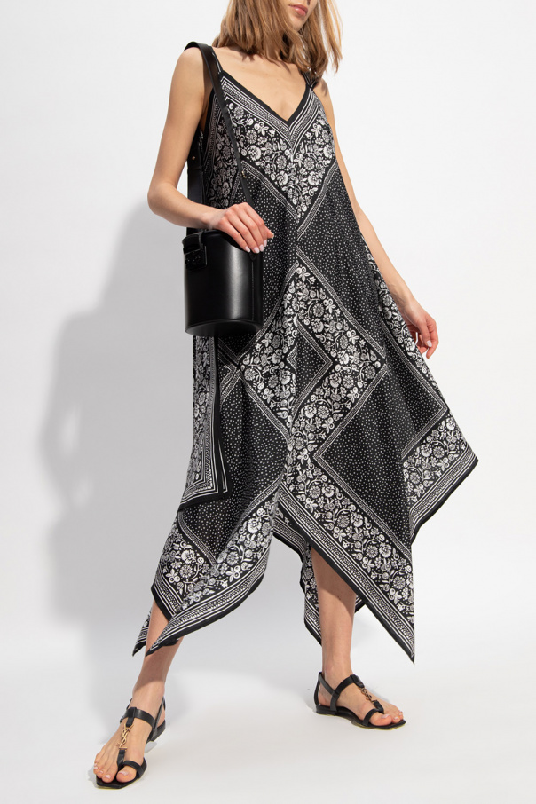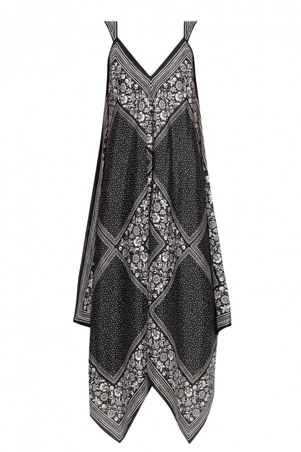 Black beach dress from See By Chloé. Made of silk with an oversize silhouette, this sleeveless garment features a V-shaped neckline and a printed white pattern.