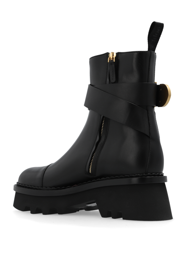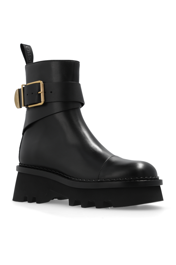 Black ‘Owena’ ankle boots from Chloe. Made from smooth leather, this model sits on a black rubber sole and employs a side zipper and adjustable strap with a gold-tone buckle featuring a logo-engraved application.