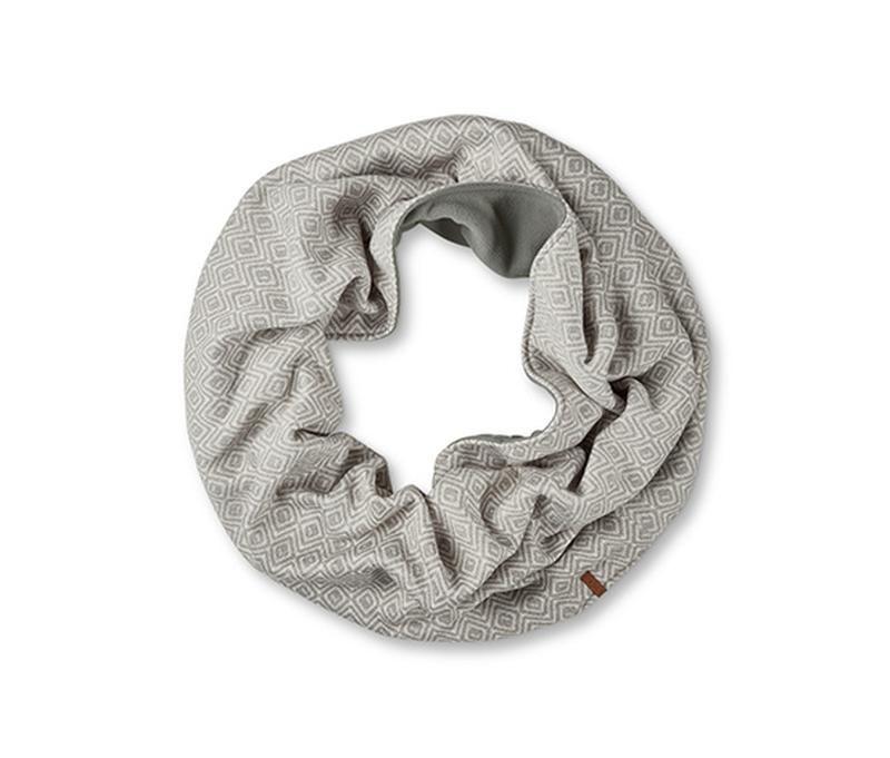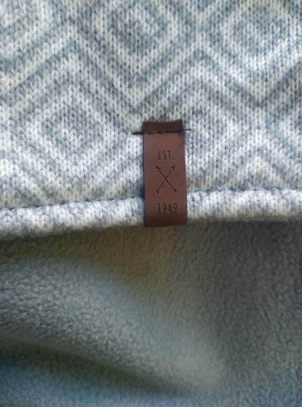 Серый флис с одной стороны и трикотажный орнамент в скандинавском стиле с другой. Бирка бренда из натуральной кожи. Рекомендую, стал моим любимым, очень стильный и качественный.
