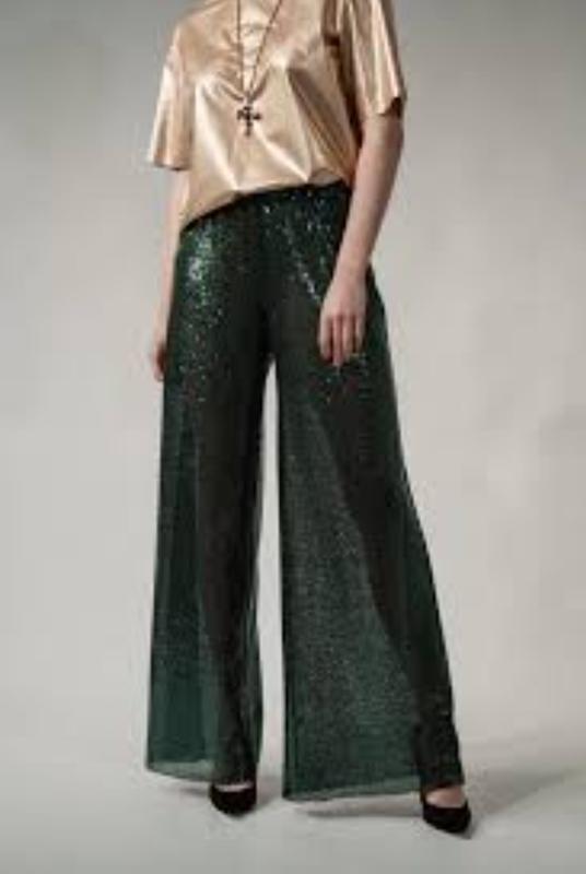 чёрные брюки палаццо с зелёным блеском в идеальном состоянии. талия на резинке. указан размер евро 38. ткань трикотажная, ближе к тонкому.