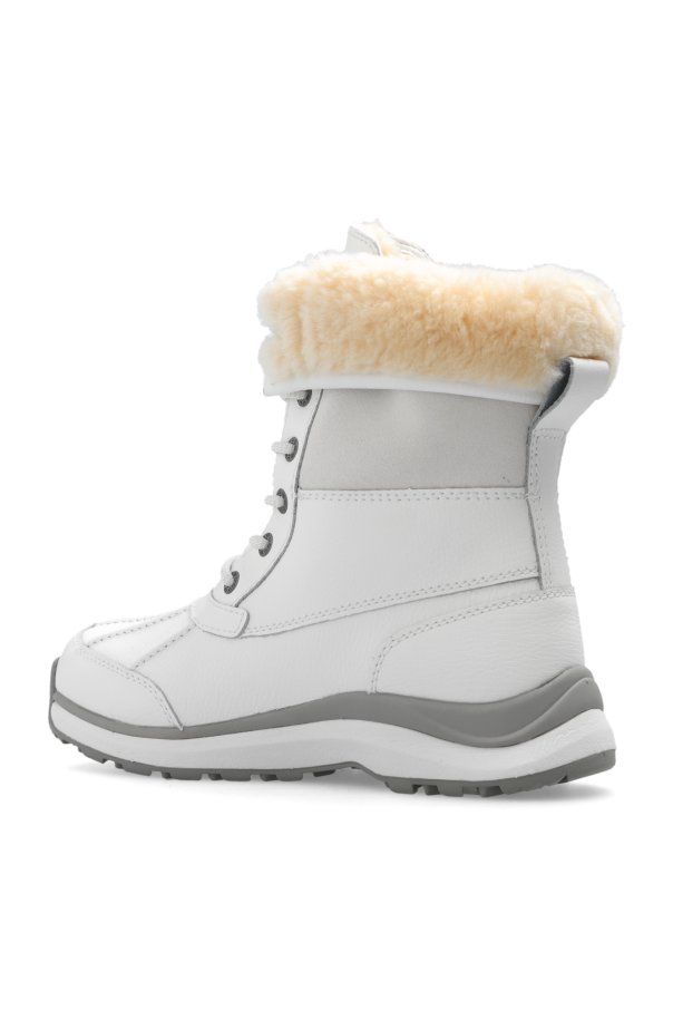 White ‘Adirondack III’ insulated boots from UGG. Crafted from waterproof leather and suede with a DryTech construction, this design features a cream UGGpure™ lining, patch on the front, embossed logo, removable Imprint by UGG™ insole, dual-density EVA midsole and molded outsole with Spider Rubber® Pods. It has a cold-weather rating of -20C to -32C.