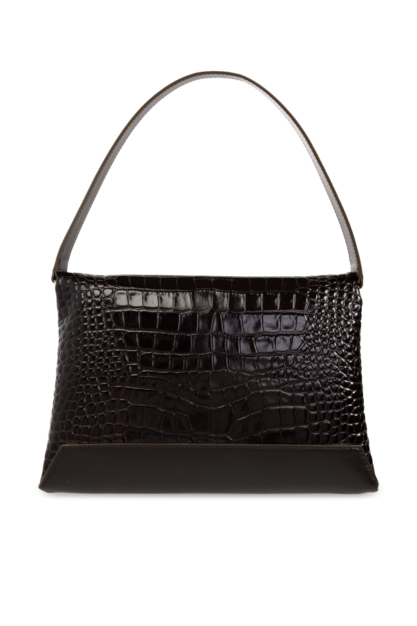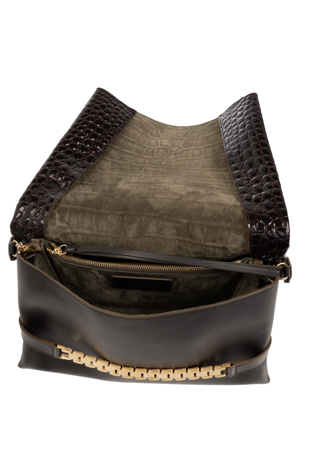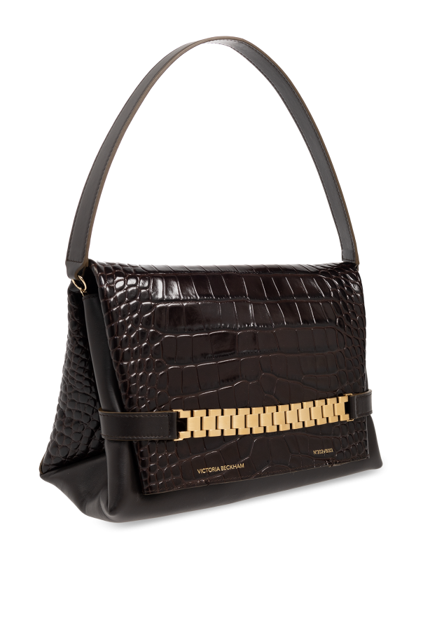 Dark brown ‘Chain Pouch’ shoulder bag from Victoria Beckham. Made of smooth leather and leather with a snakeskin effect, this design is secured with a flap and showcases an embossed gold-tone logo and metal chain detailing. It is complete with a detachable and adjustable shoulder strap, gold-tone metal hardware and a grey and green suede-clad interior with two compartments and one zip pocket.