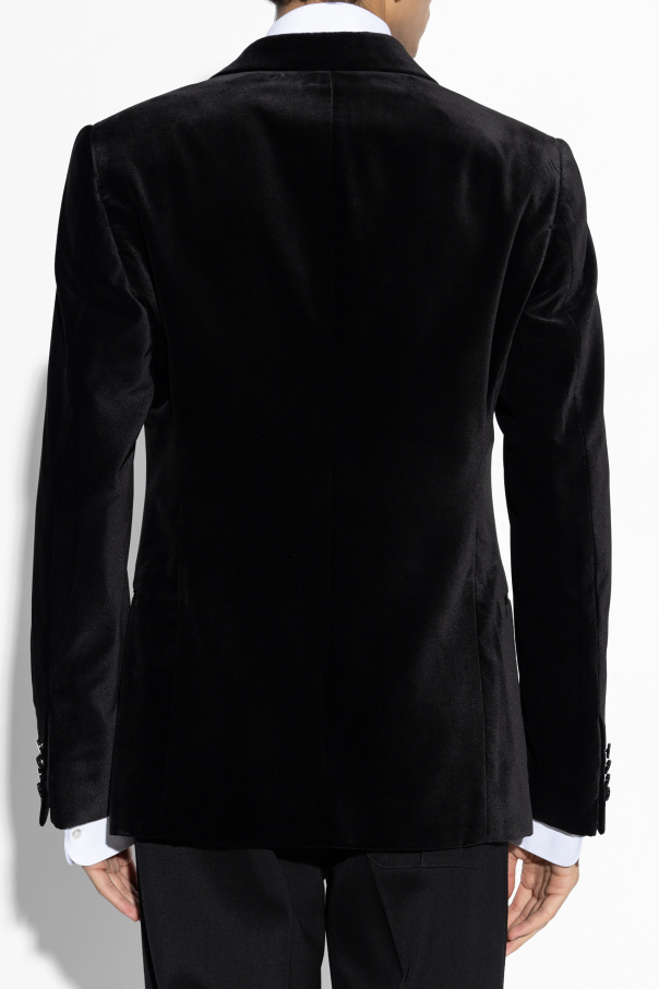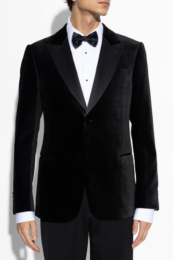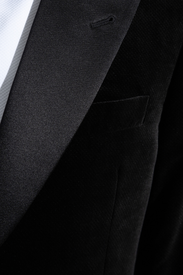 Introducing the Velvet Tuxedo Jacket from the exclusive collection by renowned designer Emporio Armani. This exquisite jacket, rendered in classic black, epitomizes elegance and sophistication. Crafted from luxurious velvet, the jacket boasts a soft touch and a subtle sheen, enhancing its opulent allure. The timeless black color ensures versatility, making it a perfect choice for formal occasions. The jacket features a classic, well-tailored fit that accentuates the silhouette. It presents traditional wide lapels with a satin finish, adding a touch of refined elegance. The front is adorned with two flap pockets and a breast pocket, maintaining a sleek and functional aesthetic. Attention to detail is paramount, with covered buttons adding to the minimalist design. The sleeves feature traditional buttons, a hallmark of formal tuxedos. The black lining harmonizes seamlessly with the overall appearance, ensuring a cohesive and polished look. As an integral part of a formal ensemble, this velvet tuxedo jacket is best paired with a crisp white shirt, a bow tie, and elegant trousers, emphasizing its suitability for evening and official events. The subtle designer signature or logo, though not prominently visible, underscores its luxurious brand identity. Why Choose This Product? Crafted from luxurious velvet for a soft touch and elegant sheen Classic black color for versatile, formal wear Well-tailored fit to accentuate the silhouette Wide lapels with satin finish for refined elegance Covered buttons and traditional sleeve buttons for minimalist sophistication Part of an exclusive collection by Emporio Armani