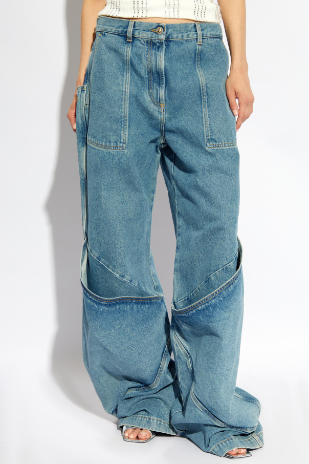 Introducing the epitome of chic utility: The Attico's Cargo Jeans. Crafted from premium 100% cotton denim, these trousers are a harmonious blend of comfort and style, making them an indispensable addition to any discerning wardrobe. The jeans boast a distinctive blue hue that captures the essence of timeless denim while adding a modern twist. The loose silhouette, accentuated by spacious, rounded cargo pockets along the thighs, lends an original and functional aesthetic. These pockets, along with the six additional slip pockets, are not just practical; they define the jeans' unique character. Contrasting stitches highlight the robust construction and attention to detail that The Attico is renowned for. Wide legs and a high waistband offer a nod to the retro allure of the 90s, yet remain thoroughly modern in execution. The back of the jeans features two large, flat pockets that enhance the garment's utilitarian appeal without sacrificing elegance. Secured with a zipper and button closure, these jeans merge ease-of-wear with luxury. Why Purchase These Cargo Jeans? Unrivaled quality and durability, thanks to the 100% cotton denim. Unique design featuring rounded cargo pockets for a distinctive look. Comfortable fit with a wide leg and high waist, ideal for various body types. Practicality meets high fashion with ample pocket space for essentials. Exclusivity and elegance from The Attico, a brand synonymous with luxury.