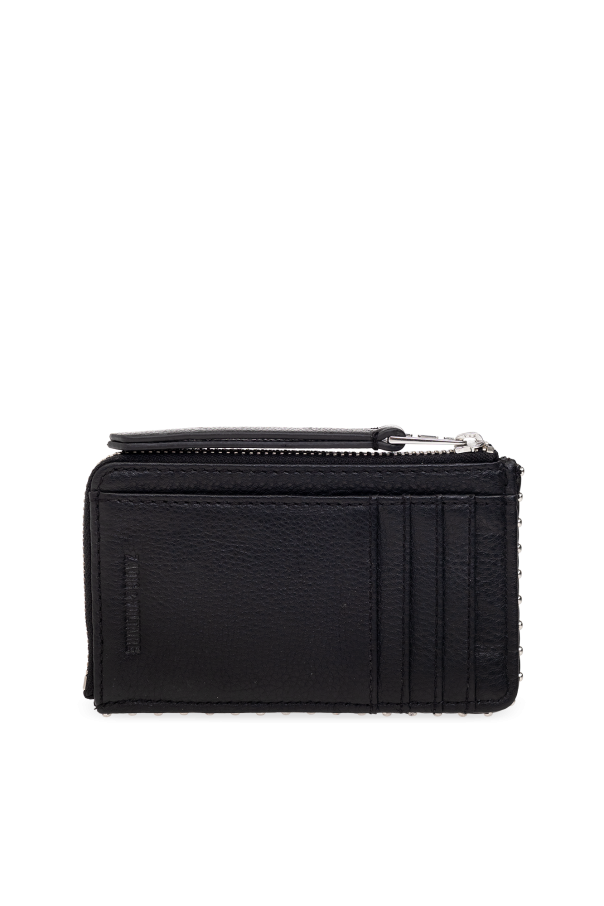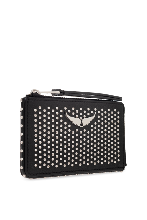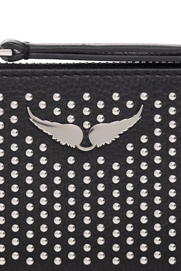 Black card case from Zadig & Voltaire. Made of leather, this item fastens via a zip and showcases a silver-tone logo plaque and studs. It is complete with an embossed logo at the back, one slip pocket and four card slots.