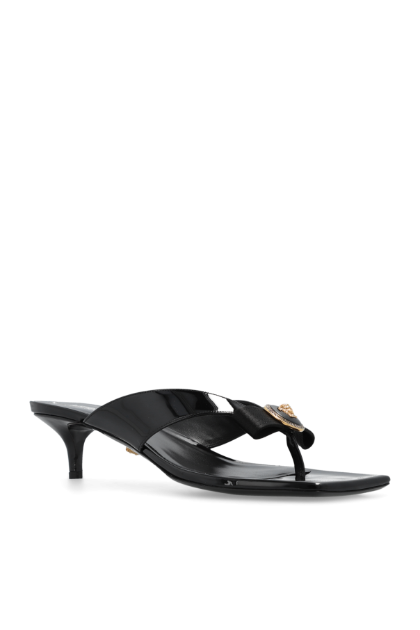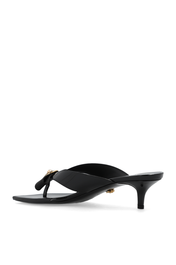 Black heeled mules from Versace. Crafted from patent leather, this pair features a 'nastro Gianni' bow in satin, enamel Medusa head motif in black and gold-tone as well as an elongated square toe.