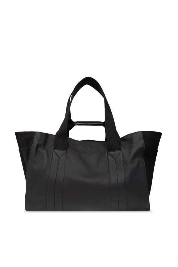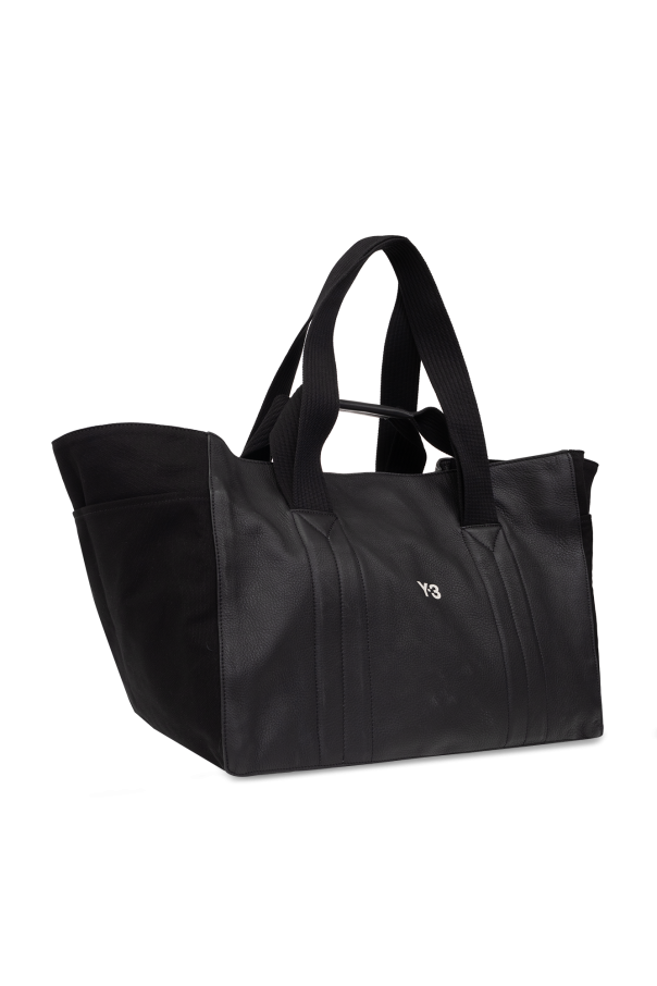 Black shopper bag from Y3 Yohji Yamamoto. Made of leather and fabric, this model fastens with a magnetic snap, light grey embossed logo on the front, slip pocket on the sides, four half-round handles, one compartment with one slip pocket inside and black metal hardware.