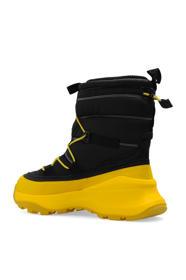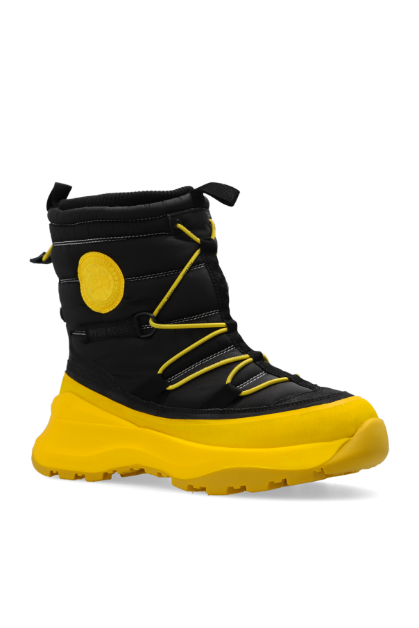 Black and yellow ‘Wild Brick’ quilted snow boots from Canada Goose x Pyer Moss. Crafted from fabric with leather trims, this pair sits on a yellow rubber sole and features lacing on the front, drawstrings at the back, elasticated cuff and logo patch on the side.