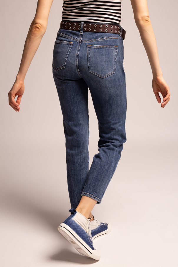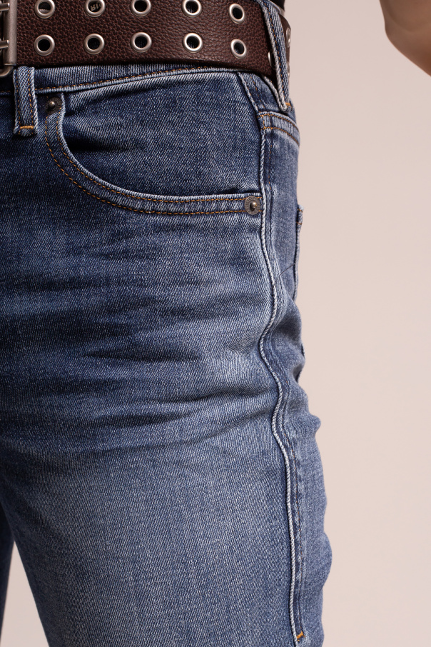 Blue ‘D-Joy’ jeans from Diesel. Fastened with a zip fly and button, this pair falls down with slightly tapered legs and is complete with three front pockets and two back pockets.