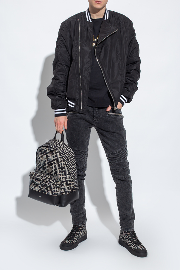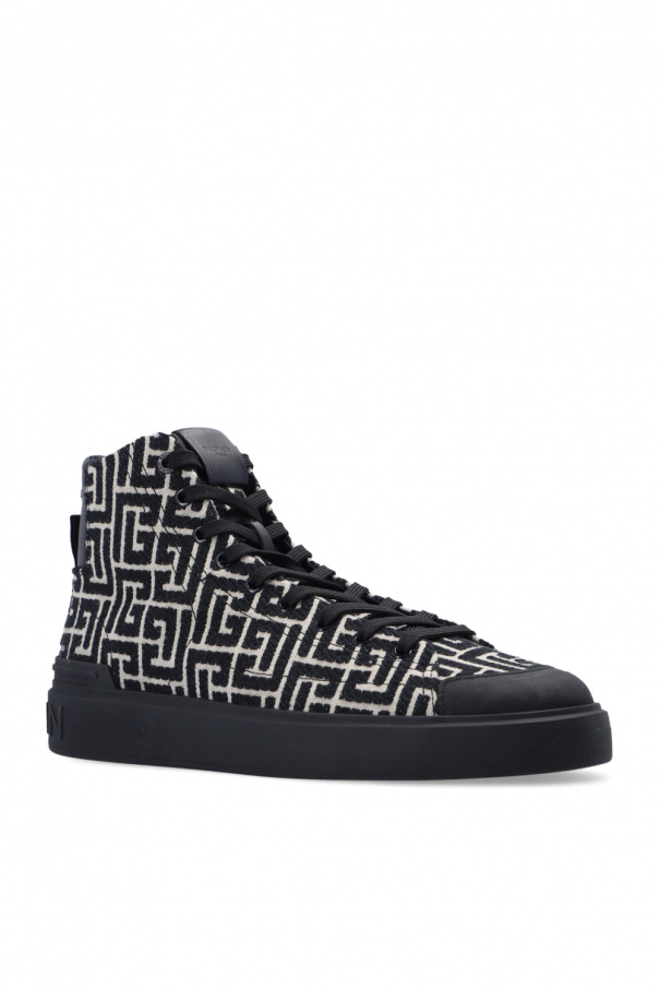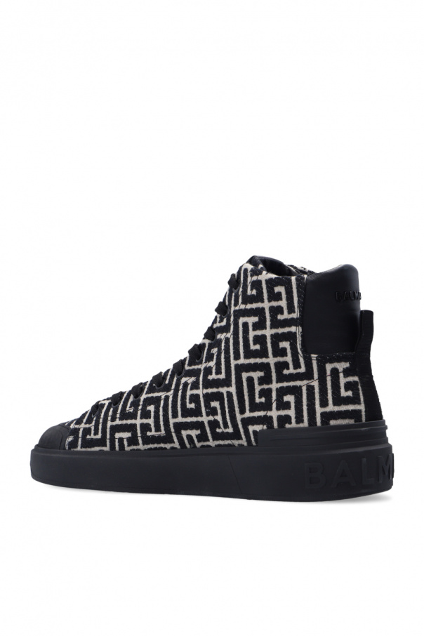 Black and cream ‘B-Court High’ high-top sneakers from Balmain. Resting on a black rubber sole, this lace-up pair features a monogram and raised logo at the back.