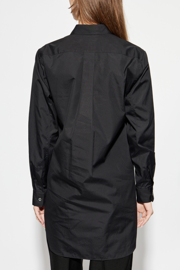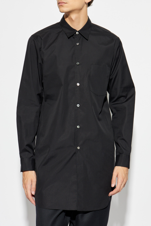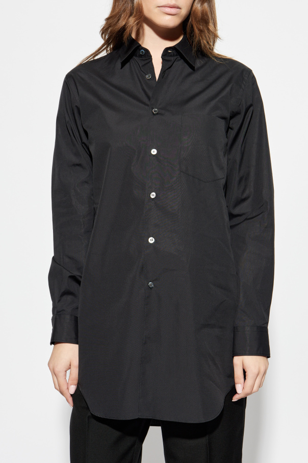 Introducing the Comme des Garçons Black Cotton Shirt, an epitome of contemporary elegance and refined craftsmanship. This unisex shirt, part of our exclusive collection, is meticulously crafted from premium black cotton, offering a smooth and luxurious texture. The shirt features a classic, straight cut with long sleeves, making it a versatile addition to any wardrobe. Its slightly rounded hem and the simple seam running down the back add subtle sophistication to its design. The front is adorned with a row of silver buttons, creating a delicate contrast against the black fabric, while a single breast pocket on the left side enhances its practical appeal. Equipped with buttoned cuffs, this shirt allows for adjustable sleeve width, ensuring a perfect fit for both men and women. The traditional collar and timeless design make it suitable for both formal events and everyday wear. Why Buy This Product? Unisex Design: Perfectly suited for both men and women. Premium Material: Made from high-quality black cotton for a sleek, elegant look. Versatile Style: Ideal for formal occasions as well as casual wear. Attention to Detail: Features silver buttons and a single breast pocket. Adjustable Fit: Buttoned cuffs for customizable sleeve width. Exclusive Brand: Designed by Comme des Garçons, renowned for their modern and innovative fashion.