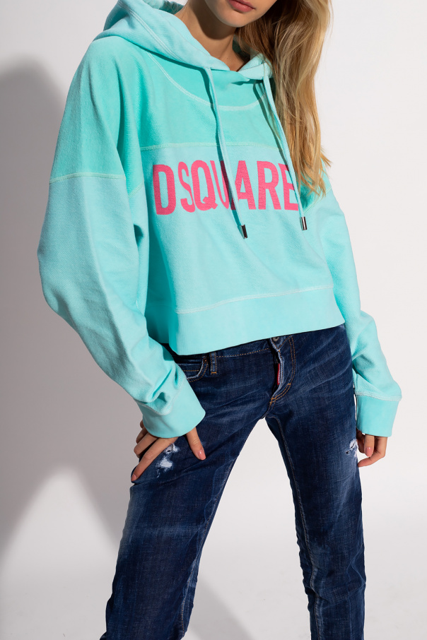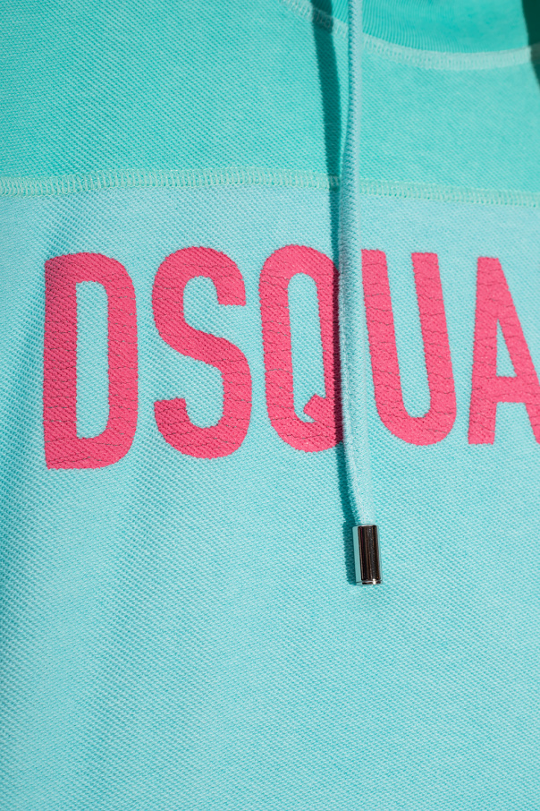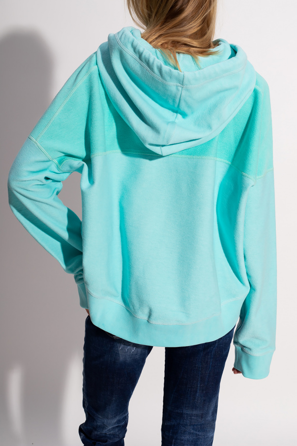 Light blue asymmetrical hoodie from Dsquared2. Crafted from cotton, this garment features a drawstring hood, pink logo print and ribbed trims at the hem and cuffs.