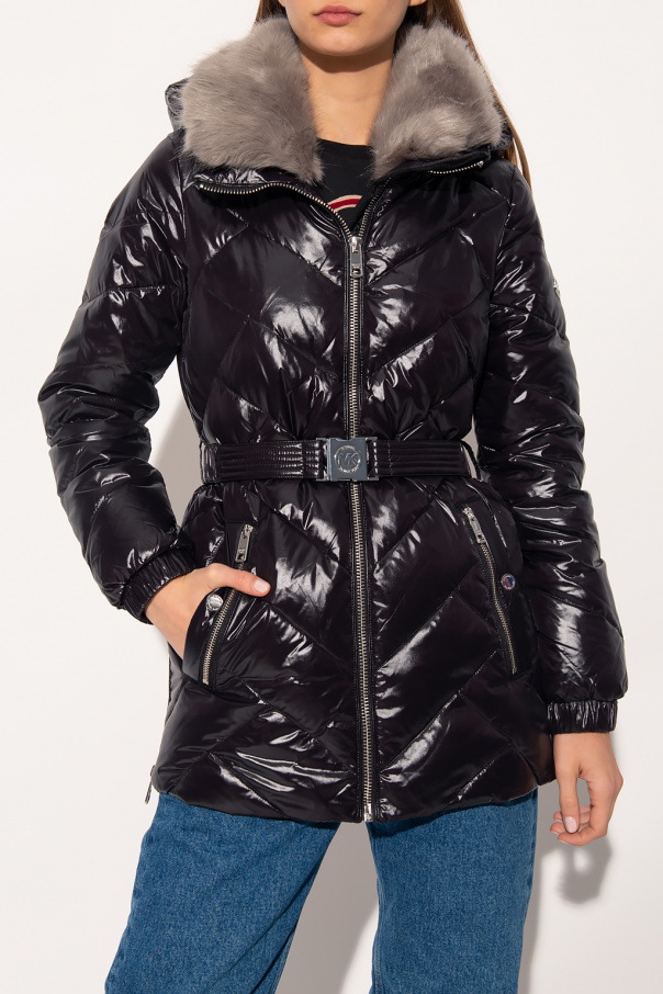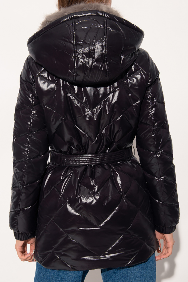 Black quilted down jacket from Michael Michael Kors. Fastened with a zip, this garment features a concealed drawstring hood, collar with a grey faux fur trim, waist belt with a silver-tone buckle, two snap-fastened pockets, two zip pockets, side zips and ribbed cuffs.