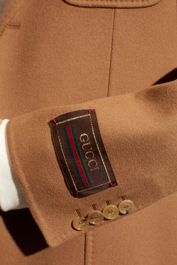 Beige blazer from Gucci. Made from a wool and cashmere blend, this design features buttons, three slip pockets, logo patch, long sleeves and single rear vent.