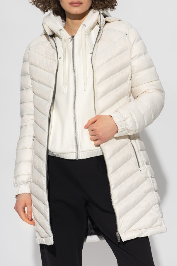 Cream quilted down coat from Moose Knuckles. Fastened with a two-way zip, this design features a detachable hood, logo detail on the shoulder and two zip pockets.