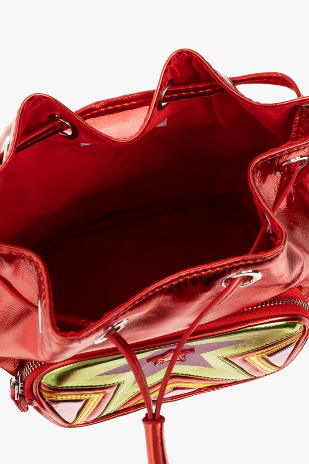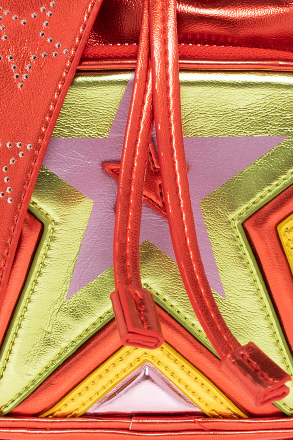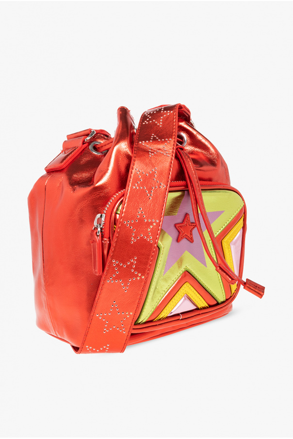 Red bucket shoulder bag from Stella McCartney Kids. Crafted from metallic fabric, this design cinches closed with drawstrings and features a zip front pocket, colourful star patches, an adjustable strap, silver-tone metal hardware and one internal compartment.