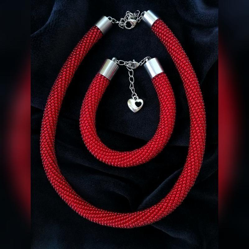 Комплект жгутов из бисера красного цвета. Длина колье 35 см + 5 см удлинительной цепочки, диаметр 9 мм. Длина браслета 17 см + 5 см удлинительной цепочки, диаметр 10 мм. Качественная фурнитура из нержавеющей стали.