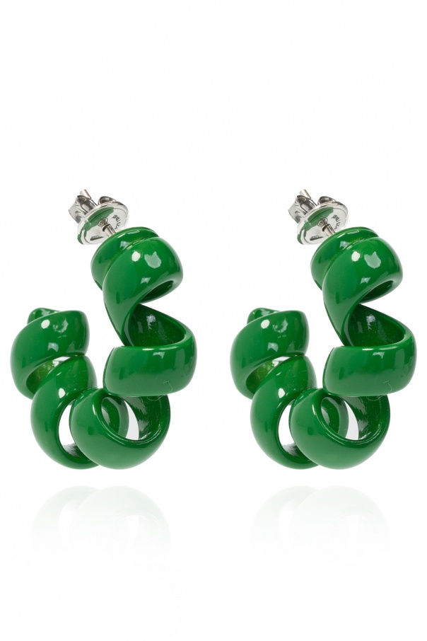 Green earrings from Bottega Veneta. This pair is made of silver with enamel and 18k gold plating.