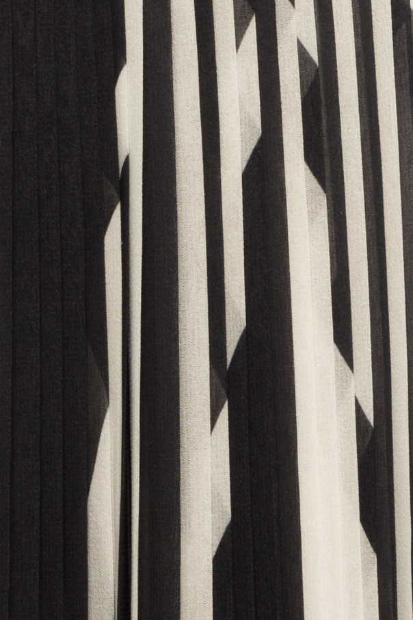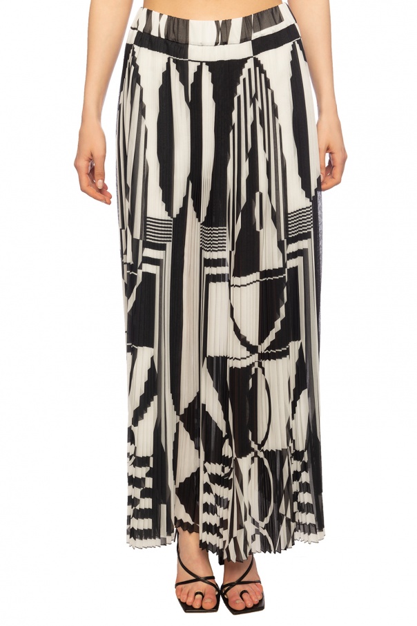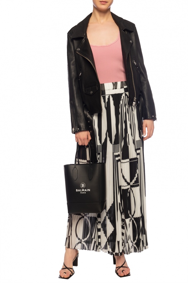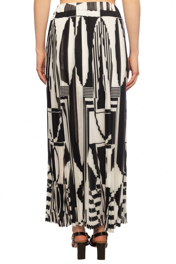 Black and white pleated skirt from Balmain. Decorated with elements featuring a geometric motif. Elasticated waistband.