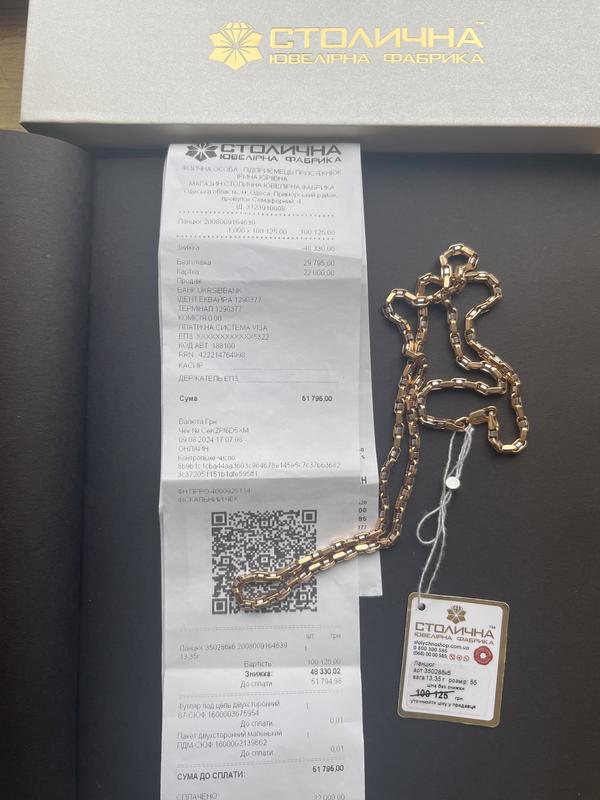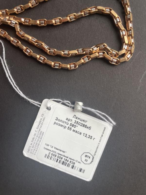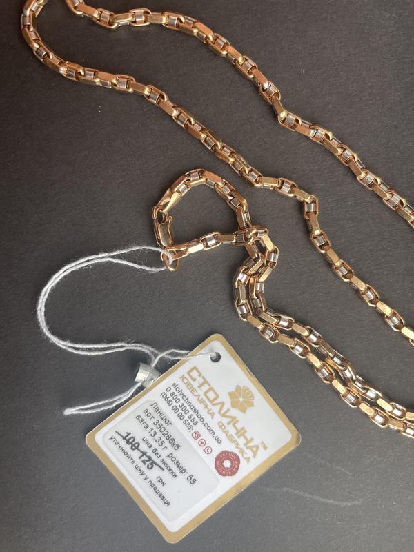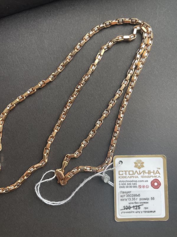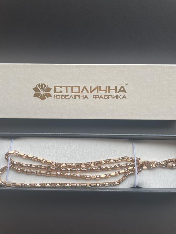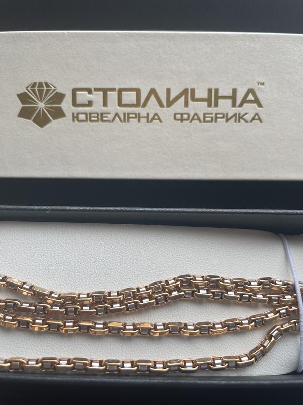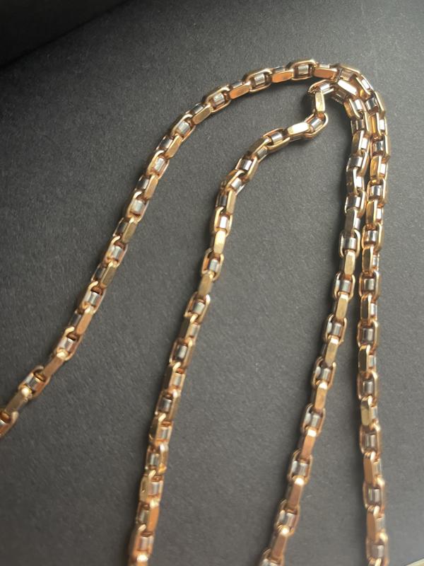 Даже бирочку не сняли. Цепь ни разу не носилась! НОВЕСЕНЬКАЯ! О чём свидетельствует бирка, чек с датой покупки. Комбинированное золото (красное с белым)