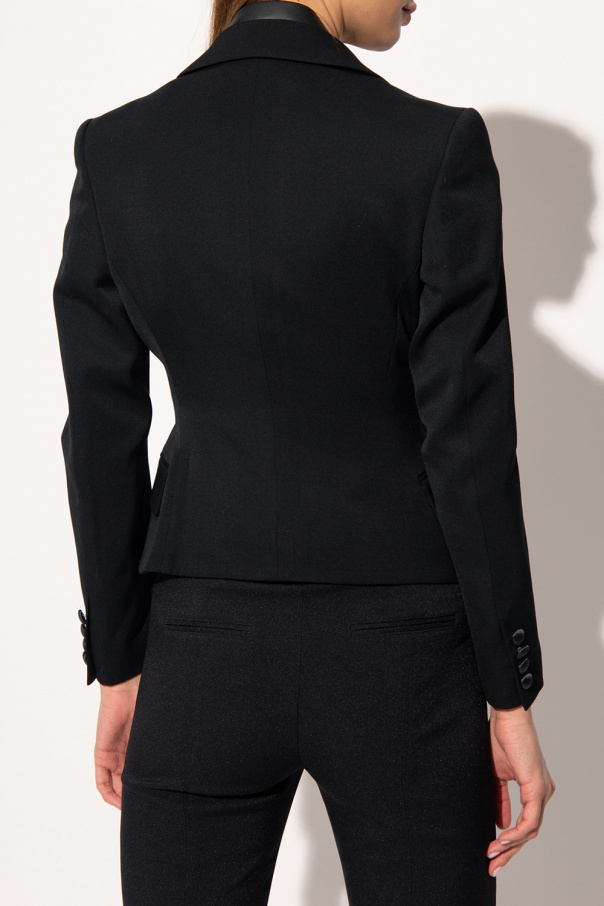 Black jacket from Undercover. Crafted from different fabric panels assembled together, this style features a cropped silhouette, zip and button fastenings, peak lapels, padded shoulders, long sleeves, one slip pocket and two flapped pockets.