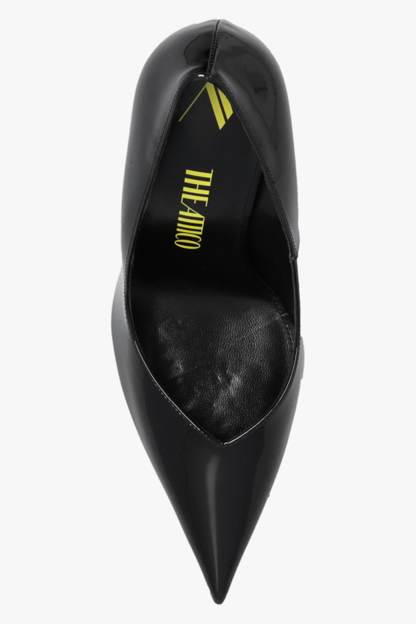 Black ‘Cheope’ wedge mules from The Attico. Crafted from patent leather, this model features a pointed toe, a black leather sole and a distinctive geometrical wedge.